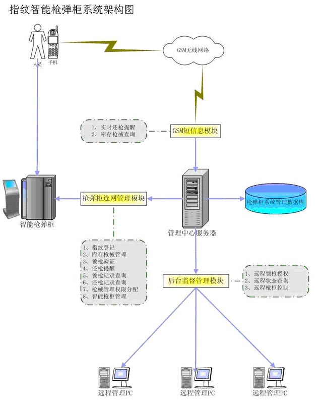 本系統(tǒng)應(yīng)具有三級聯(lián)網(wǎng)動(dòng)態(tài)管理模式:第一級管理在基層用槍單位,第二級管理為基層所直屬的管轄單位監(jiān)控后臺,第三級管理為再上一級的管轄單位監(jiān)控后臺。智能槍支管理系統(tǒng)監(jiān)控后臺的主要功能:實(shí)時(shí)監(jiān)控用戶應(yīng)用前臺的領(lǐng)/還槍記錄、報(bào)警記錄、確認(rèn)用戶應(yīng)用前臺上新增和修改的人員資料、禁止和批準(zhǔn)警員使用槍支等。槍庫管理員每次用戶應(yīng)用前臺新增或修改警員的資料,都必需有領(lǐng)導(dǎo)在相應(yīng)的監(jiān)控后臺用指紋或密碼對資料進(jìn)行確認(rèn)才能生效。